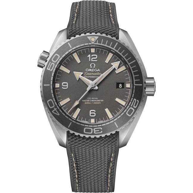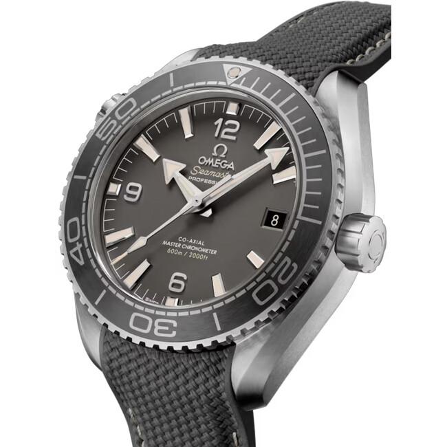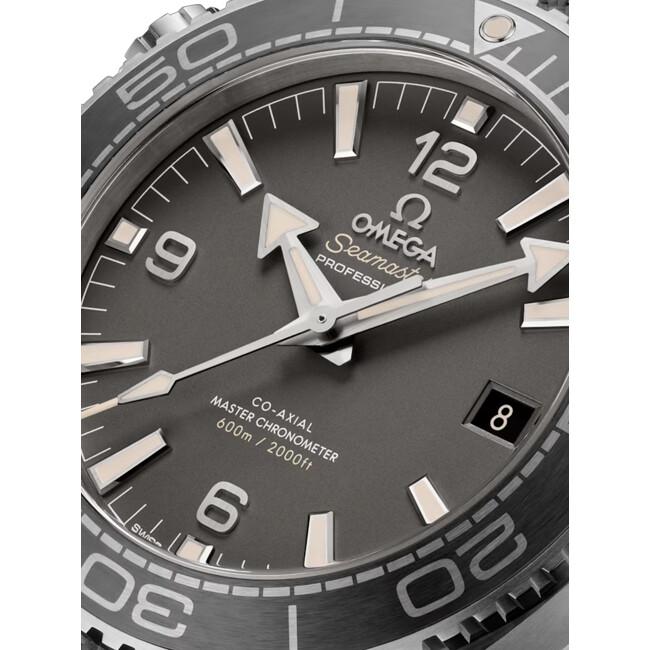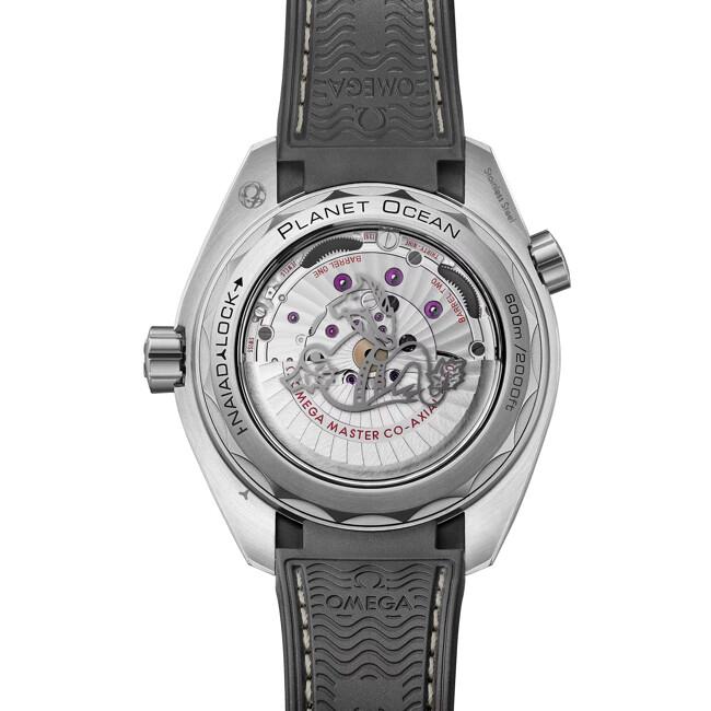 Powered by the Co-Axial Master Chronometer Calibre 8900, this Seamaster Planet Ocean is worn on an integrated dark grey rubber strap with a structured pattern and beige and dark grey stitching. The NAIAD LOCK caseback is completed with a metallized seahorse on the sapphire crystal.