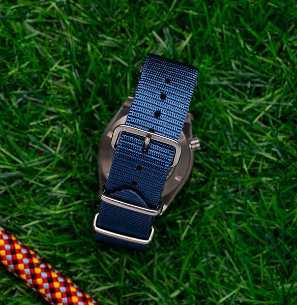 Denim (blue) Color Nylon with 316L grade stainless steel buckle and keepers. The ADPT Strap is based on a military design that features a security-band underneath, ensuring that your watch stays on should a spring bar fail. Made in America.