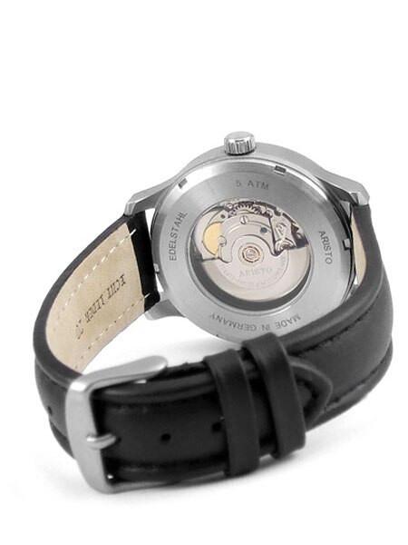 This Aristo 3H116 watch features a distinctive aviator dial design with large minute markers around outer dial and a smaller inner dial for the hours. The hands and markers are treated with SuperLuminova for impressive night-time viewing. Turn the watch over and an exhibition back shows off the Swiss Made, automatic movement. The 42mm case is sandblasted to obtain a non-reflective satin finish, and the case thickness of only 10mm allows it to easily slide under your shirt cuff. A high quality leather strap with matching stitching completes the look. It is a great looking aviator watch.