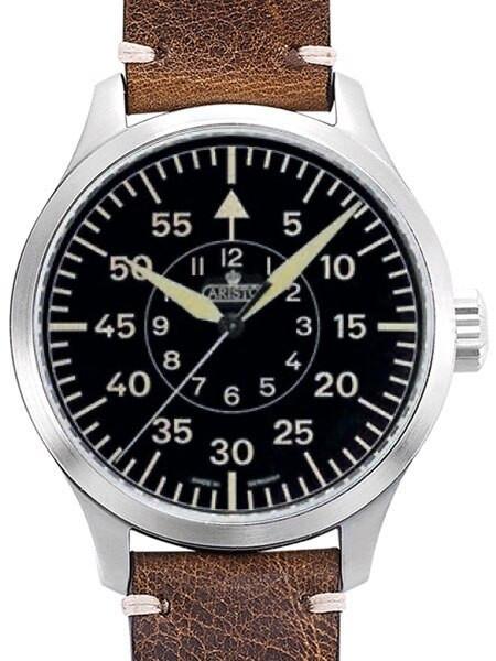 This Aristo 7H98 watch features a classic type B aviator dial design with vintage color luminous hour and minute markers (glows green in the dark). A Swiss ETA 2824-2 self-winding movement powers the watch (viewable via an exhibition window back). The 47mm stainless steel case has a brushed finish the crystal on the front of the watch is scratch resistant sapphire. A textured leather strap with tie-offs at the lugs gives the watch a great presentation on you wrist. Great vintage looking pilot watch.