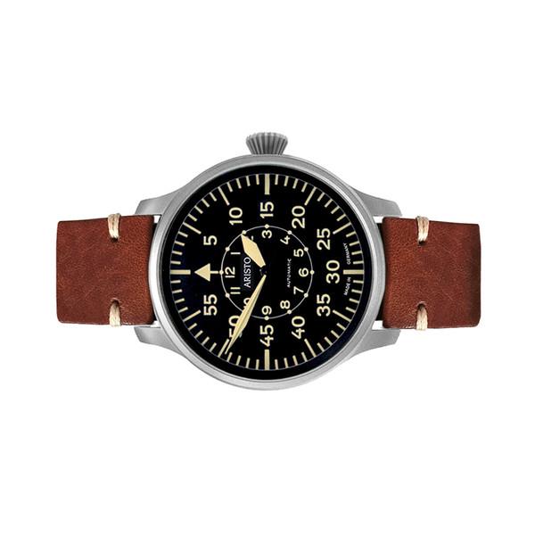 This Aristo watch features a classic black aviator dial design with easy to read hour and minute markers. The hands and markers are treated with Super-LumiNova for an impressive glow-in-the-dark feature. An oversize, diamond cut crown makes for quick time adjustments even if you are wearing gloves. Turn the watch over and an exhibition back shows off the Swiss SW200 automatic movement. The 42mm case has a sandblast finish, and with a case thickness of only 10.4 mm it easily slides under your shirt cuff. Comes with a brown leather strap with contrasting stitching.