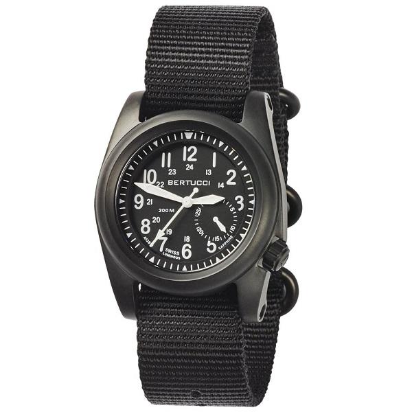 The Bertucci A-2S Ballista is a great looking field watch featuring an all metal Japanese quartz movement, an offset crown at 4:00, a black dial with luminous hour markers and hands, and a luminous 24-hour military time scale. It also has a date sub-dial, a screw down crown, a screw-in case back, scratch resistant sapphire crystal, patented DX3 case design, and a high quality one piece black nylon strap. The lug bars are solid and designed not to break or come loose. The ION plated stainless steel case is 40mm in diameter. Lug width is 22mm. Water Resistance is 200 meters.