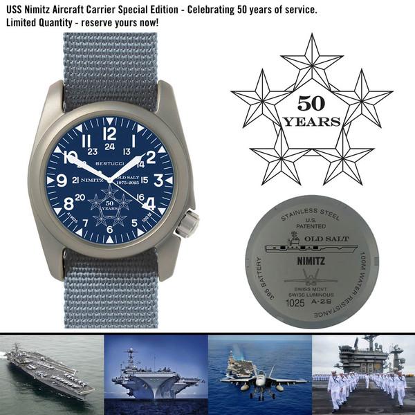 Bertucci was commissioned directly by the crew of the USS Nimitz to build their 50th Anniversary watch celebrating 1975 to 2025 of defending America. The Nimitz is one of only 11 US Nuclear Aircraft Carriers in service. It continues to support the mission of the warfighter 50 years after first sailing.