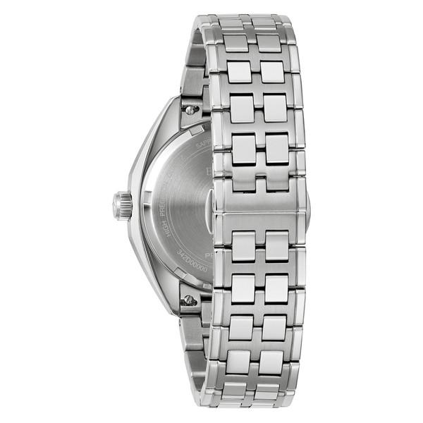 Straight from the 1970s comes the Bulova 1973 Jet Star, an iconic model from the brands impressive history, now equipped with an equally impressive movement. Borrowing from its historic forebear, the stainless steel case features a striking angular design with broad facets and a domed sapphire crystal. The magnificently claret sunburst dial is accented by a black chapter ring, applied black and red hour markers, and matching silver tone and red hands. Luminescent plots at each hour and fill in the hands allow for exceptional legibility in every environment, while a date display sits perfectly at 3 o’clock.