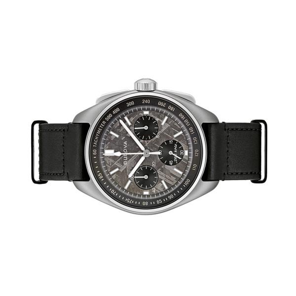 The out-of-this-world timepiece features original design elements and an eye-catching six-hand chronograph dial meticulously crafted from genuine Muonionalusta meteorite. This 4.5-billion-year-old iron meteorite was discovered in Northern Scandinavia in 1906, and its varied crystalline pattern is reflected in the exclusive design that makes every dial one-of-a-kind. Luxurious updates include a 43.5mm sandblasted silver-tone grade 5 titanium case with polished accents, creating a dynamic and incredibly lightweight presence on the wrist. Slim chronograph pushers and a crown featuring the Bulova tuning fork logo are perfectly proportioned and positioned at 3 o’clock.