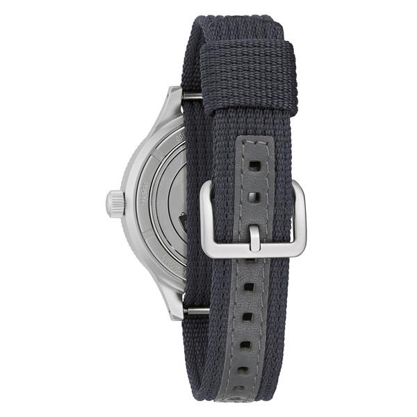 The Bulova MIL-SHIPS stainless steel case is like nothing you’ve ever seen before. With a 41mm diameter, the drilled lugs are just 16mm wide and the case is 15.1mm tall, including the massive dome of the sapphire crystal. On the included black nylon single-pass strap and with a 50mm lug-to-lug, the watch has a pronounced presence on the wrist. The unique bezel is fully lumed and locks into place until it is pushed down and rotated. The screw-down crown features the retro Bulova logo and ensures a substantial 200m of water resistance.