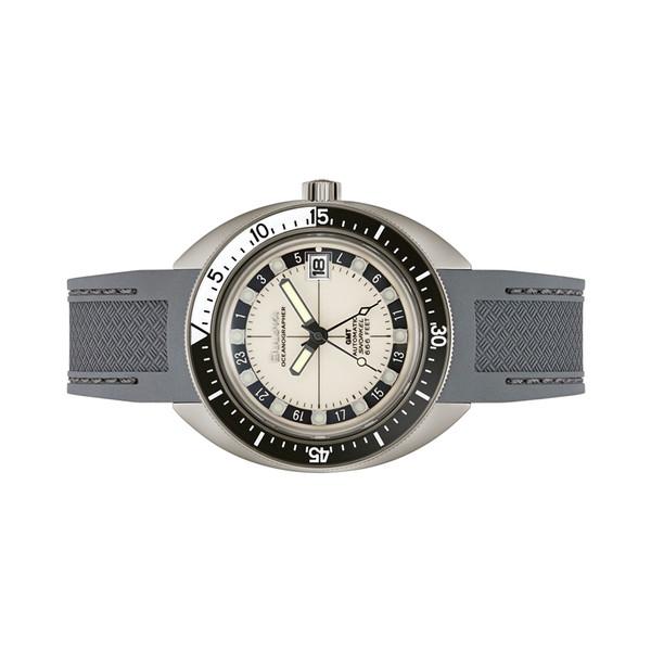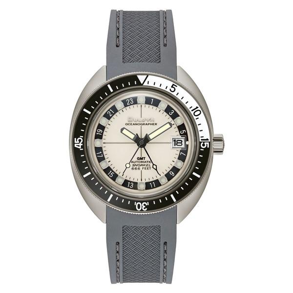 For the uncompromising thrill seeker, there is no alternative to this all-new Bulova men’s Oceanographer GMT. The perfectly sized 41mm stainless steel case features a grey IP coating, a screw-down crown that provides 200 meters of water resistance, and a unidirectional rotating black-and-white timing bezel. Under the box sapphire crystal, the fully luminescent white dial features a black 24-hours scale and minute markers, applied round luminescent hour markers, and a date display. The bold handset features luminescent fill for exceptional low-light legibility, and an independently adjusted hour hand that allows you to quickly set the local time. The Oceanographer GMT is powered by a self-winding GMT movement with 24-jewels and a power reserve of 42 hours, protected by a screw-down caseback. Paired perfectly with a fitted black silicone strap with a rugged three-piece buckle. When you need a timepiece that can go everywhere you want and never fall behind, the men’s Bulova Oceanographer GMT is the only option.