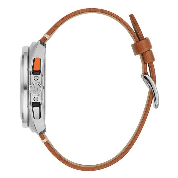 Built on Bulova’s vibrant history in motorsport – from soap box derbies to the upper echelons of auto racing – the new men’s Racer chronograph watch is fine-tuned and designed for performance. The contoured silver-tone stainless steel case features a unique design evoking the aerodynamic curves of the world’s fastest automobiles. A two-tone orange and black tachymeter ring offers further functionality, while pronounced pushers provide a distinctively automotive aesthetic. The black 5-hand chronograph dial features an orange and white racing pattern chapter ring, with a date display at 6 o’clock and black subdials displaying the chronograph minutes and the 24-hour time. A bold orange chronograph seconds hand ensures optimal legibility no matter the speed. The dial is appointed with applied silver-tone markers and matching beveled hands, all filled with a super-luminous material for low-light visibility. The watch is paired with a perforated brown leather racing-style strap with a pin buckle closure. Whether gripping the wheel around the bend at the track or on your daily commute, the Bulova men’s Racer chronograph is a stylish expression of racing history and a passion for speed.