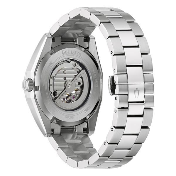 The striking blue dial features silver-tone accents including beveled applied hour markers and hands with luminescent fill for low-light legibility. A subtle chapter ring marks out the minutes and seconds, while embossed minute markings offer a unique depth to the dial. At 12 o’clock, the Bulova tuning fork logo marks the top of each hour, while the double aperture at 6:30 offers a glimpse at the beating heart of the automatic caliber.