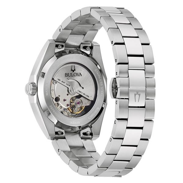 The Bulova men’s Surveyor is defined by exceptional quality and sophisticated aesthetics. The silver-tone stainless steel case features sculpted edges and faceting which provide an effortless wear on the wrist, with polished and brushed finishing, a flat sapphire crystal, and a matching quick-release 3-link stainless steel bracelet with a push-button deployant clasp. The striking and features silver-tone accents, hands with luminescent fill, debossed minute markers, and a magnified date display. The watch is powered by an automatic 21-jewels and a 42-hour power reserve, which can be seen in full through a mineral crystal exhibition window in the caseback. For those with a discerning eye for refined luxury, this Bulova men’s timepiece is the obvious choice.
