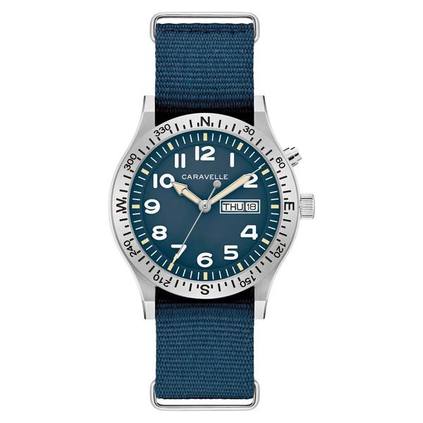 Inspired by vintage American field watches, the men’s Caravelle Field watch is a purpose-built timepiece meant for adventure. Made from 316L stainless steel, the case features a compass bezel and angled lugs. Bold numerals and a day and date display offer utility and exceptional legibility against the matte blue dial, which lights up with the push of a button. Paired with a durable blue nylon pass-through strap for added comfort and security, the men’s Caravelle Field watch won’t break a sweat, even when you do.