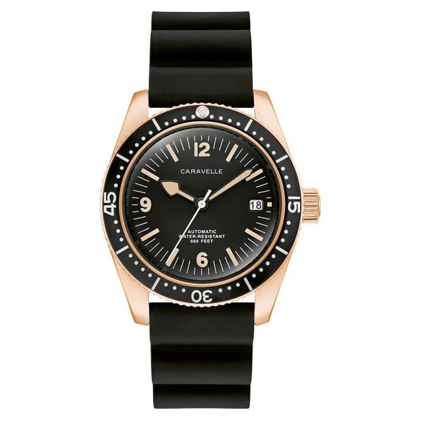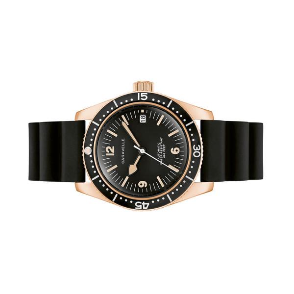 The return of an icon: The men’s Caravelle Sea Hunter is reborn for the modern age. Inspired by one of Caravelle’s most celebrated models, the new Caravelle Sea Hunter is sized for modern tastes at 39mm, with a rose gold-tone case crafted from 316L stainless steel and echoing the sporting form of the original. Ensuring ideal legibility and functionality, a high-contrast black dial with a date display and luminescent hands and markers is complemented by a matching rotating 60-minute timing bezel.