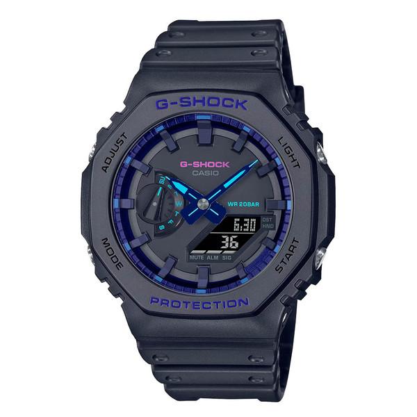 The analog-digital GA2100VB-1A takes a dive into the world of virtual reality. The basic black coloring of the watch is accented by blue violet, which creates a futuristic atmosphere of virtual reality for the GA2100 with octagonal bezel.