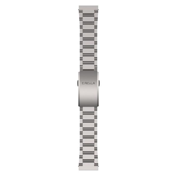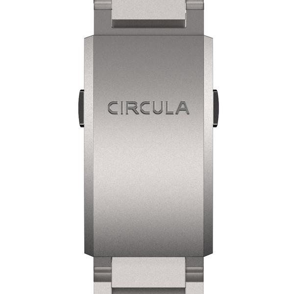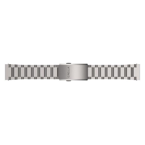 This is a Circula bracelet. The bracelet is solid link, solid endlink, with a lug width of 20mm, tapering to 18mm at the clasp. The maximum length of the bracelet is 170mm, and the links are fastened with screws. The double pushbutton clasp has 3 positions of micro-adjust. The spring pins are quick release. The bracelet fits the Circula ProTrail or ProFlight stainless steel models only (not the DLC model).