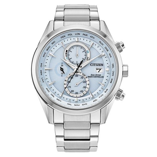 On the sky blue dial, a vertical three-register chronograph is at work, with appliques of silver-tones adding dimensionality alongside the utility of a 3 o'clock date display. Other advanced features include world time in 26 time zones, a perpetual calendar with day and date indicators, 12/24-hour timekeeping, and a power reserve display. Featuring light-powered Eco-Drive Atomic Timekeeping functionality, the radio controlled timepiece self-adjusts to time or calendar when traveling overseas by receiving local time signals in four different regions. Water resistant up to 100 meters. Caliber H800.