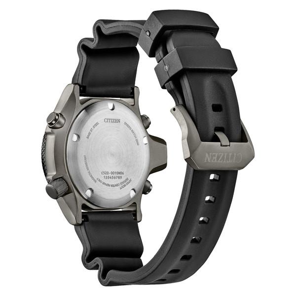 Ready, Set, Dive. An iconic name with a reinvented hybrid construction, the new retro-inspired Citizen Promaster Aqualand Quartz is an ISO-compliant watch that's ready for your next underwater adventure. Equipped with a maximum depth memory, rapid ascent alarm, and auto start dive mode, you won't want anything else on the wrist when heading out to the ocean. A robust, gray-tone stainless steel case with a screw-down crown compliments the ocean black polyurethane strap and high legibility luminous green three-hand dial. Water resistant up to 200 meters. Powered by the quartz-driven Caliber C520.