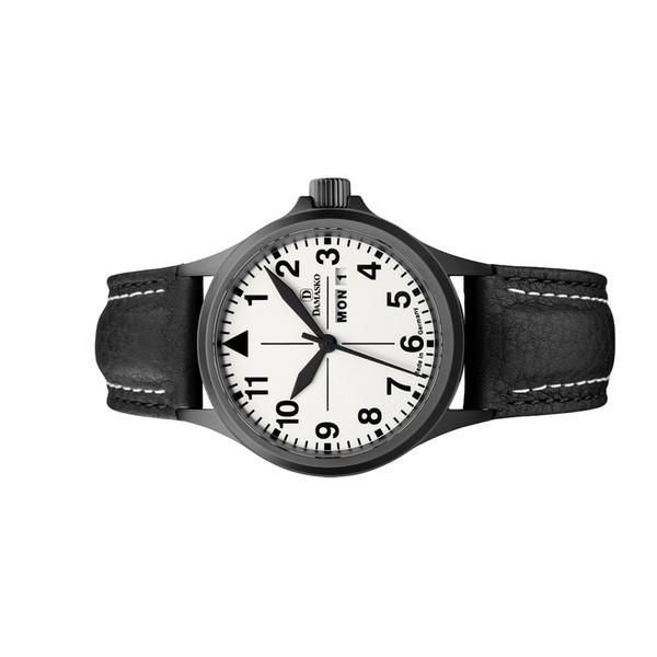 The knurled screw-down crown and mechanism is fully hardened and along with a screw-in case back, provides you with a 100-meter water resistance rating. A sapphire crystal with anti-reflective coating on both sides gives you increased clarity when you check the time. The day and date window is found at a special position slightly below the center axis. Includes a black leather strap with white contrasting stitching.
