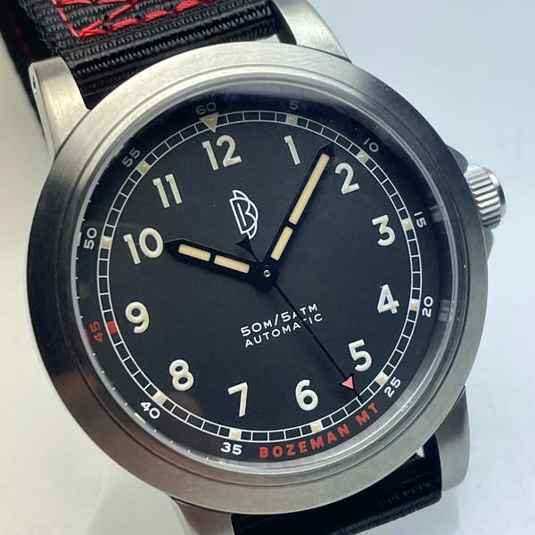 Utility aside, we have added a few unique features to the Field Watch that bring an additional layer of personality to the timepiece. We have included an observation case-back that allows for a clear view of the decorated movement, and a red "45" minute indicator marked on the dial. The red forty-five minute indicator is in reference to the latitude of Bozeman, MT, which is approximately forty-five degrees North on the latitudinal plane.