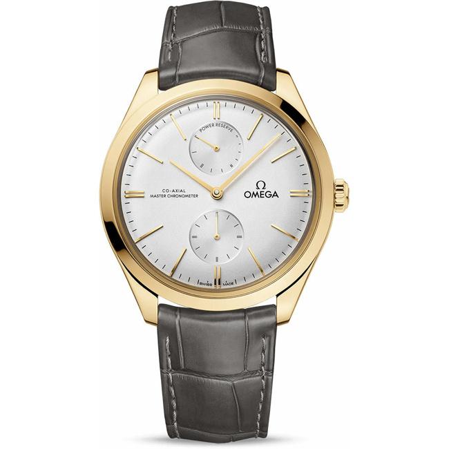 This model has a polished 40 mm 18K yellow gold case, which is presented on a grey leather strap. The domed crystal silvery dial includes a Power Reserve display at 12H, a Small Seconds display at 6H, along with hands and domed indexes in 18K yellow gold.