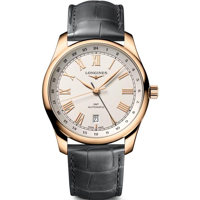 The frosted silver dial features a 24-hour scale in transferred Arabic numerals, a railroad minute track, eleven applied gold Roman numerals and the date aperture at 6 o'clock. Gold hands indicate the time, while the black GMT hand tones with the 24-hour scale numerals. This Longines Master Collection GMT model is worn on an anthracite grey leather strap fitted with a rose-gold tongue buckle.