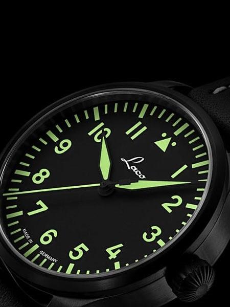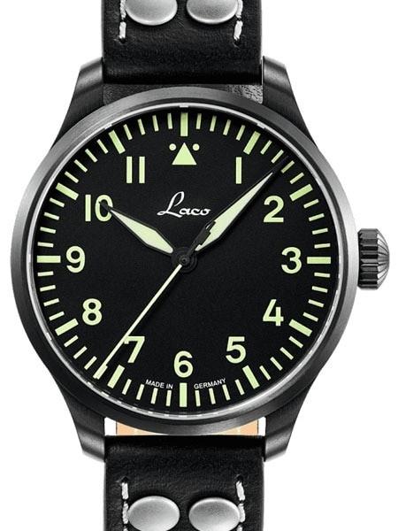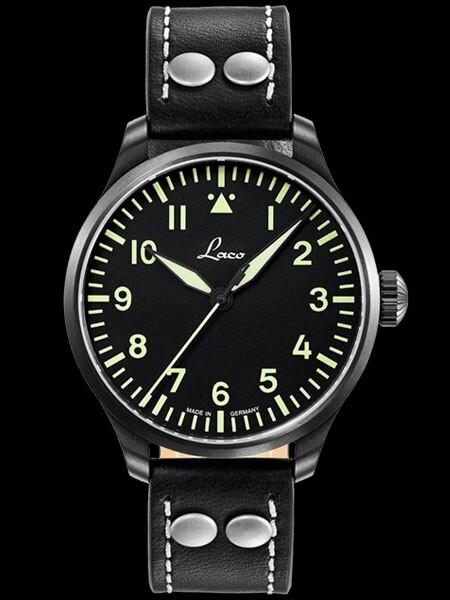 The handsome Laco Altenburg (model 861991) model features a 39mm black PVD stainless steel case and a scratch resistant sapphire crystal. The 39mm case design houses a Laco 21 automatic (self-winding) movement. The Altenburg model has a black Type A pilot dial with large hours. The hands and dial markers are treated with SuperLuminova for excellent readability in the dark. Like the original WWII Laco watches, there is no date window. Includes a really nice black leather strap with rivets like those used in WWII.