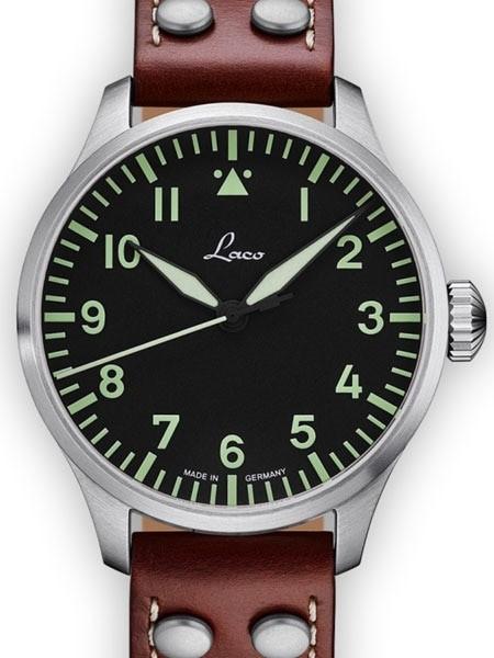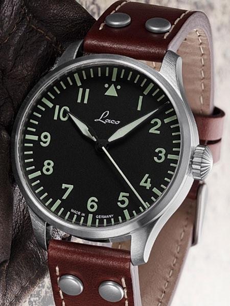 The new version of the Laco Augsburg 861688 model now features a scratch resistant sapphire crystal. The 42mm case design houses a Laco 21 automatic (self-winding) movement. The Augsburg model has a black Type A (or pilot) dial with large hours. The hands and dial markers are treated with SuperLuminova for excellent readability in the dark. Like the original WWII Laco watches, there is no date window. Includes a really nice brown leather strap with rivets like those used in WWII.