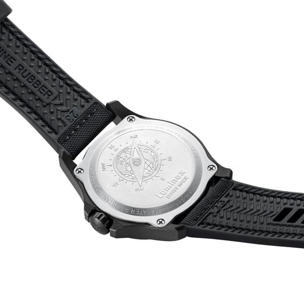 The dial is protected by sapphire crystal with anti-reflective coating. The 43 mm CARBONOX™ case is matched with a black rubber strap that can also be swapped with the additional second strap that comes with the watch, a sand webbing NATO strap.