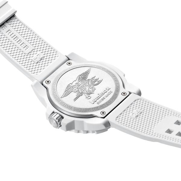 The black dial with white numerals ensures maximum readability in daylight, while Luminox Light Technology (LLT) provides constant visibility in complete darkness for up to 25 years, critical for missions in low-contrast environments. A white genuine rubber strap offers a secure, comfortable fit, while the unidirectional rotating bezel allows precise tracking of elapsed time, making it an essential tool for military personnel and Arctic explorers alike. Whether navigating icy terrains or facing tactical challenges, the Navy SEAL 3500 – Arctic Edition is engineered for peak performance in the most demanding conditions.
