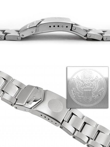 This elegant stainless steel bracelet is made using high quality 316L stainless steel in a fine satin finish and it contains a total of 14 solid links. It features a superior floating double screw link system and a locking buckle for extra security. It also has a diver's extension hidden underneath the clasp. Adjust the bracelet length using the 5 micro adjustments on the signed U.S. seal clasp and by removing up to 6 links. The solid end links are designed to perfectly fit Marathon stainless steel case watches with 20mm lug width. Note: Bracelet is for WW194006 and WW194007 Marathon watches.