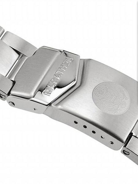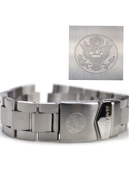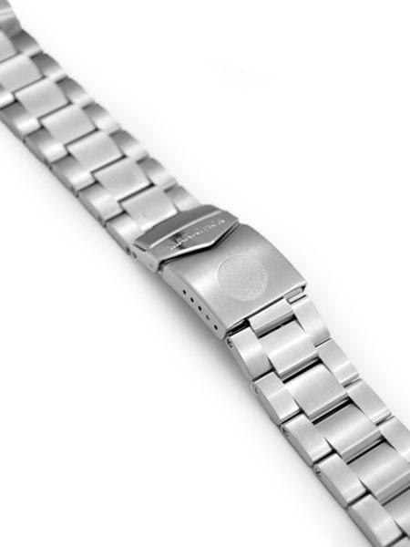 This elegant stainless steel bracelet is made using high quality 316L stainless steel in a fine satin finish and it contains a total of 14 solid links. It features a superior floating double screw link system and a locking buckle for extra security. It also has a diver's extension hidden underneath the clasp. Adjust the bracelet length using the 5 micro adjustments on the signed U.S. seal clasp and by removing up to 6 links. The solid end links are designed to perfectly fit Marathon stainless steel case watches with 22mm lug width. Note: Bracelet is for WW194014 and WW194018 Marathon watches.