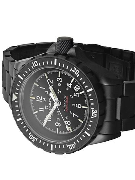 The watch comes with a 316L stainless steel bracelet that has 1 to 1.2 micron thick black anthracite IP plating (the industry average is only 0.50 to 0.70 microns). It has 14 solid links that are individually sandblasted, plated and hand assembled. There is a double-screw link system on each link. The bracelet also resists sweat and general salt fog corrosion. It has a butterfly clasp with micro adjustments and a push-button safety clasp. Manufactured in La Chaux de Fonds, Switzerland. This watch combines military toughness with Swiss craftsmanship in a watch that will get the job done and look great doing it.