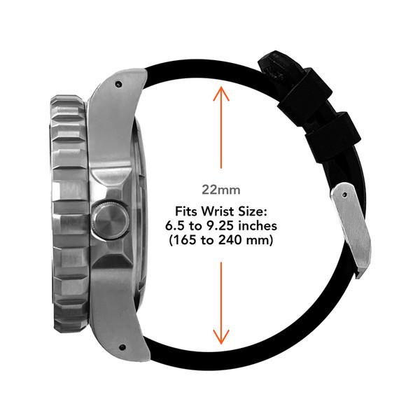 Features a 3 Piece Rubber Strap System (made in La Chaux-de-Fonds, Switzerland) crafted from FKM Rubber to meet the requirements of high-performance military applications. The 3-Piece system comes with one (6 o'clock) tail piece with 8 adjustment holes, and two (12 o'clock) buckle pieces of different sizing that allow the wearer to tailor the length to fit their wrist size.