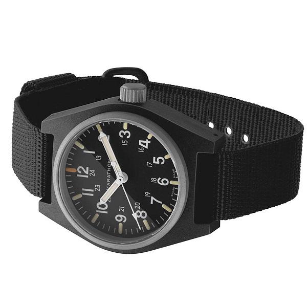 Developed by Marathon Watch Company as a field watch to be issued to military personnel, the General Purpose Quartz is a watch that meets all the requirements of a true military field watch. Made from a highly durable, impact resistant fibershell case that is water resistant to 3 atmospheres (30 meters - 100 feet), sweat resistant and will not yield to the elements. The fibershell case of the General Purpose Quartz is also a passive matte finish, as to not give away infantry position through reflections, which would occur on a normal metal case. Fibershell also is an extremely lightweight material, an important factor on the battlefield where every ounce counts. The General Purpose Quartz now comes with a scratch-resistant sapphire crystal. The back of the watch is made of 316L surgical stainless steel, a steel with low carbon content that will not corrode over time. Note: the caseback now has a user accessible battery hatch for changing the battery.