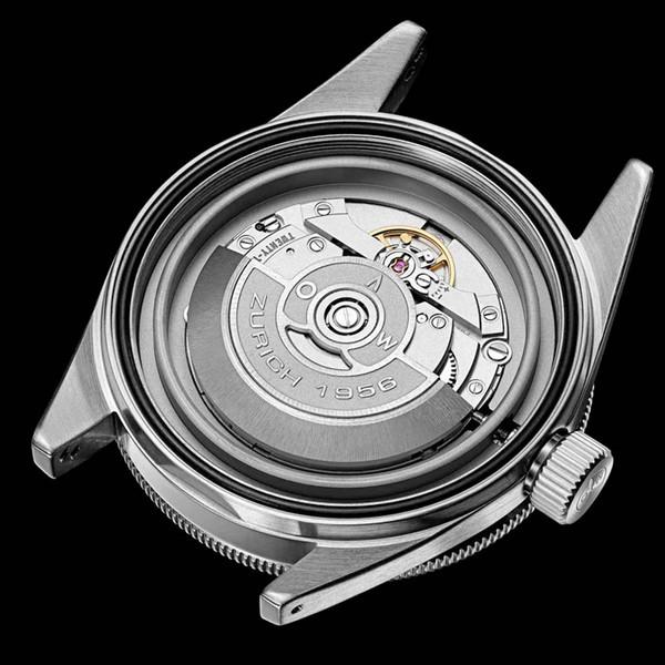 Inside the OW P-104 Selectron is OW’s own inimitable bespoke Soprod Newton Precision P092. This outstanding automatic calibre is independently tested for dependability and durability at the internationally renown Laboratoire Dubois in Chaux-de-Fonds. It is modified to OW’s specifications and adjusted in five positions, the movement has been finished in accordance with our rugged aesthetics, and ‘OW Zurich 1956’ is engraved into the nickel-plated base, on which sits a co-designed, custom rotor in the shape of the OW marque.
