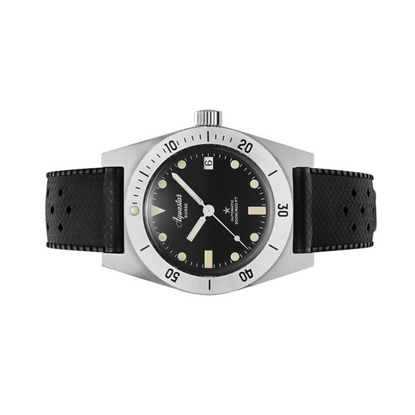 Thoughtfully sized in a 37mm stainless steel case the Model 60 is a somewhat unique reference in the deep Aquastar archive, as it follows a more traditional dive watch execution, using bold hour markers and lume-filled paddle hands, a 60 minute rotating bezel, and a center-mounted seconds hand, eschewing the bold asymmetrical dial elements that would characterize later Aquastar watches, like the iconic Deepstar Chronograph. In keeping with Aquastar’s modern traditions, the new Model 60 maintains a robust 200 meters of water resistance, and is powered by a top-grade, 100% Swiss Made La Joux-Perret G100 automatic movement with 68 hours of power reserve, a solid Tungsten ball bearing rotor and the sophisticatedly engineered KIF shock protection system. The Aquastar model 60 comes on a choice of straps and bracelets. A seatbelt NATO, a genuine or a beads of rice stainless steel bracelet.