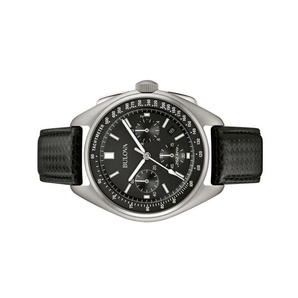 The Lunar Pilot chronograph features a 45mm stainless steel case with slim chronograph pushers and a crown featuring the Bulova tuning fork logo. The case features polished and brushed finishing and a flat sapphire crystal and is paired a textured black leather strap and includes a black nylon strap with a nubuck leather patch that commemorates the date of mission (DOM) as 08021971. The caseback is engraved with the tuning fork logo and the dates of the mission and landing.