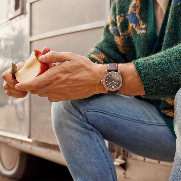 Take action and show your inner drive with the sporty styling of the Brycen, the latest addition to the Weekender collection. Featuring a silver-tone Super Titanium™ case with a brushed finish, the 41mm timepiece is durable in form and function with its matching bi-directional rotating bezel and triple-link bracelet. On the sunray blue dial, highly legible timekeeping elements are at work, with a yellow seconds counter providing a pop of color and a 3 o'clock date window providing daily utility. Featuring our proprietary Eco-Drive technology – powered by light, any light. Never needs a battery. Caliber number J810.