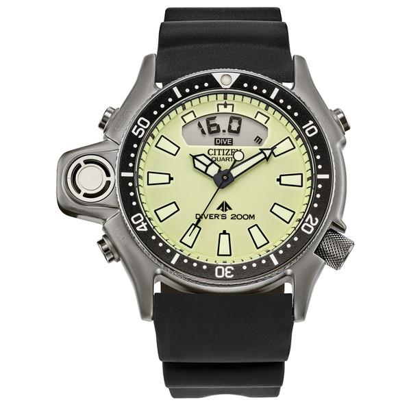 Ready, Set, Dive. An iconic name with a reinvented hybrid construction, the new retro-inspired Citizen Promaster Aqualand Quartz is an ISO-compliant watch that's ready for your next underwater adventure. Equipped with a maximum depth memory, rapid ascent alarm, and auto start dive mode, you won't want anything else on the wrist when heading out to the ocean. A robust, gray-tone stainless steel case with a screw-down crown compliments the ocean black polyurethane strap and high legibility luminous green three-hand dial. Water resistant up to 200 meters. Powered by the quartz-driven Caliber C520.