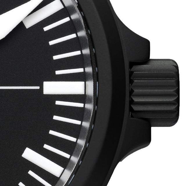The 39mm diameter case is made from surfaced hardened, submarine steel that is bead blasted to produce a non-reflective matte finish. It is finsihed with a very hard DAMEST coating. Overall height is 9.95mm. Lug width is 20mm. Weight without strap is 57 grams. The crown screws-down via the “DAMASKO System” to achieve a water resistance rating of 20 bar or 200 meters. A rubber "max sport" strap secures the DK30 to your wrist.