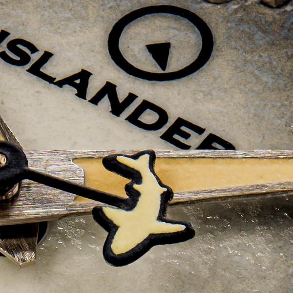 Surrounding the dial is a 120 click, uni-directional ratcheting bezel topped with a vintage luminous curved sapphire insert, matched to the dial color. You'll notice a shark dorsal fin hidden in the blood-red bezel triangle. A coin-edge crown is screwed down to ensure 200 meters of water resistance, and contains a lumed Islander logo (another first for us!).