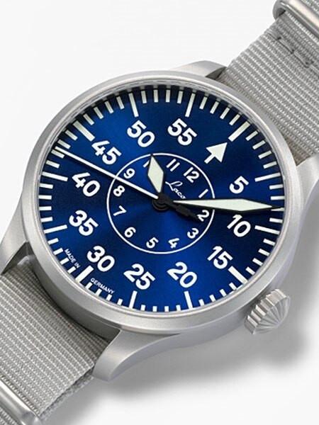 The Laco Aachen Blaue Stunde 862103 model features a beautiful sunburst blue (type B) dial and a scratch resistant sapphire crystal. The 39mm case design houses a Laco 21 automatic (self-winding) movement. The hands and dial markers are treated with SuperLuminova for excellent readability in the dark. Like the original WWII Laco watches, there is no date window. Includes a handsome grey military style textile strap. 18mm lug width. Exhibition window case back.