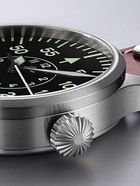 The new version of the Laco Aachen 861690 model now features a scratch resistant sapphire crystal (only a diamond can scratch it). The 42mm case design houses a Laco 21 automatic (self-winding) movement. The Aachen model has a black Type B (or bomber) dial with large minutes. The hands and dial markers are treated with SuperLuminova for excellent readability in the dark. Like the original WWII Laco watches, there is no date window. Includes a really nice brown leather strap with rivets like those used in WWII.