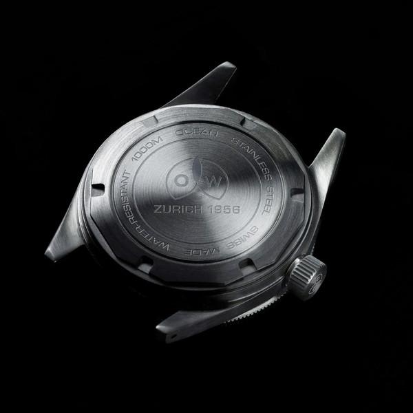 The movement is housed in a 39.56 mm, 316L stainless steel, 1,000m water-resistant case, which is stamped, machined and brushed in Jura, Switzerland. The OW C-1000 S is also equipped with a reinforced case back, an extra-strong, domed sapphire crystal and a special quadruple gaskets screw-down crown. The watch has a stainless steel rotating bezel with a mineral insert to measure dive times, and Super-LumiNova®-covered indexes and hands for extra readability when diving to extreme depths.
