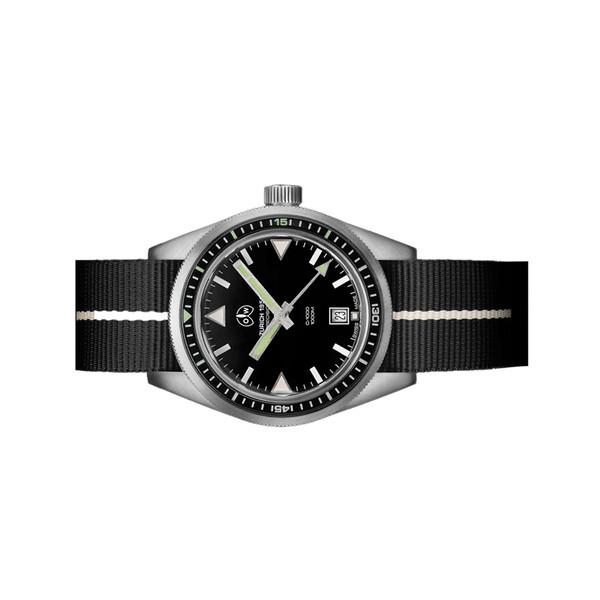 To mark the introduction of the C-1000 MkII, the watch comes on a 'Freediver' RAF style nylon band. The thin white line woven through the strap symbolises the static line used by free-divers to guide their decent and accent to and from the darkness. The band is finished with an engraved OWZ thorn style buckle and two stainless steel keepers.