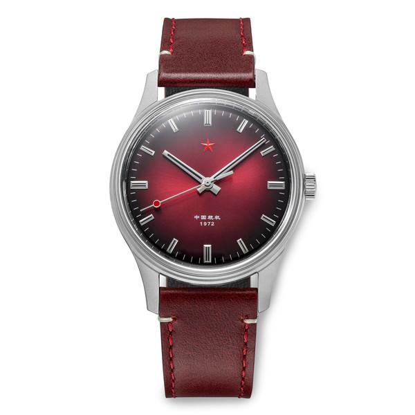 Here is quite a simple offering from Red Star watches. This 3-hand dress watch features a replica handwind Tongji (unified) mechanical movement. It has 17 jewels and a power reserve of about 36 hours. The Burgundy dial is adorned with the Red Star logo and faceted indices are used for the markers. "1972" is marked on the dial, denoting a time when Chinese watchmaking was at the top of its game.